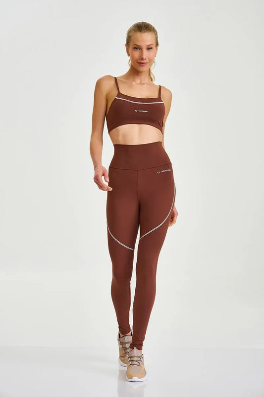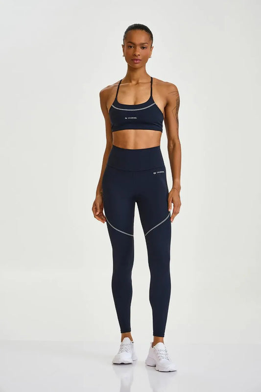 Legging de cintura alta confeccionada em poliamida e elastano com toque compressivo que modela e...