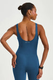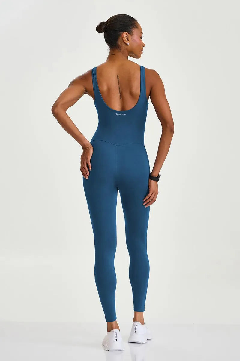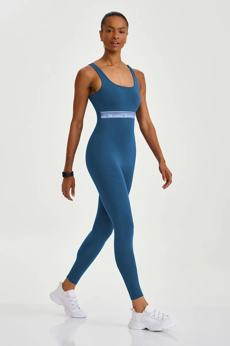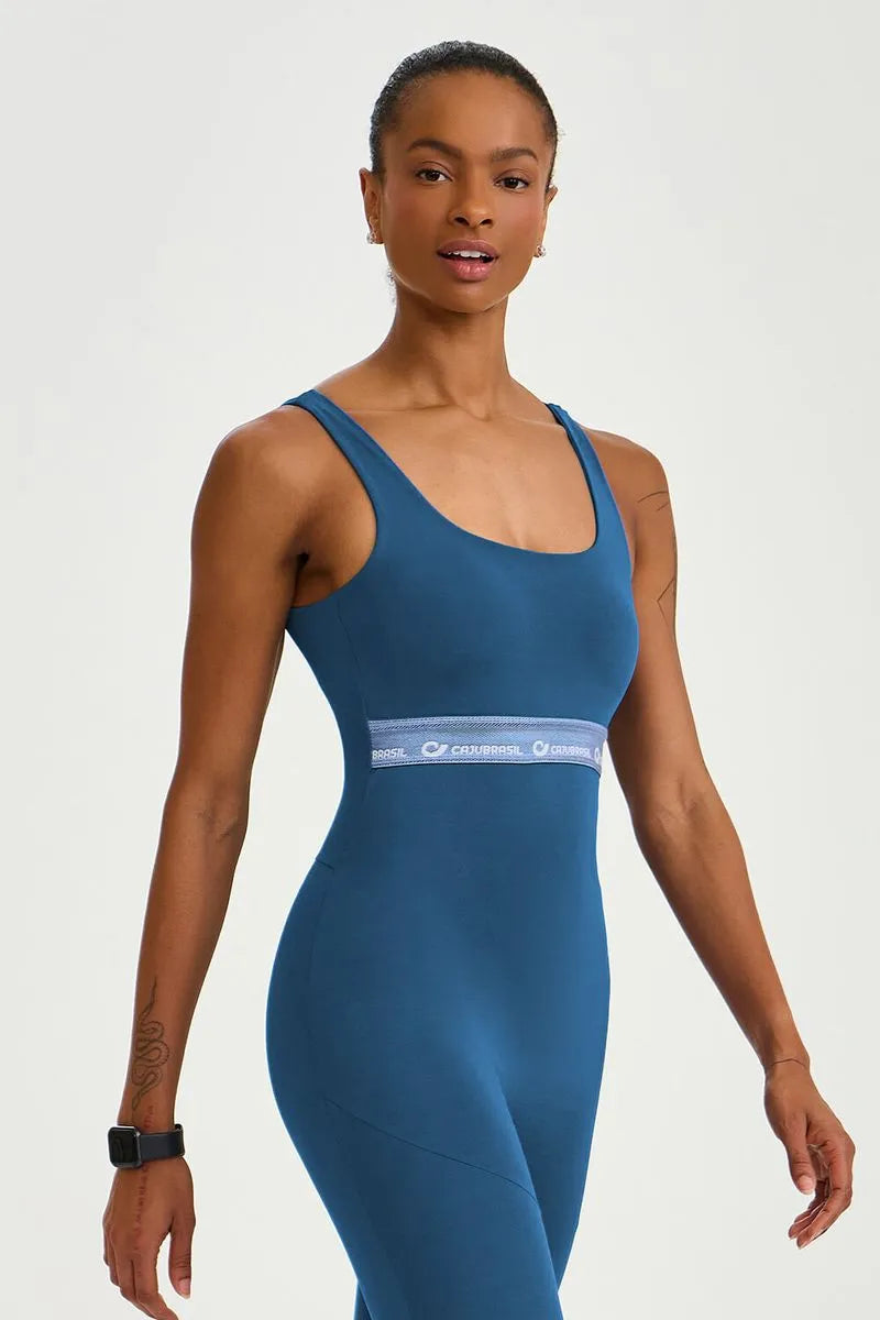 Macacão NP Empina Bumbum em tecido tecnológico, cor Azul Blue Jeans. Confeccionado para unir performance e acabamento premium, o modelo traz bojo fixo para suporte imediato, cintura com elástico perolizado que valoriza o busto e recortes estratégicos que moldam e elevam a região glútea. A modelagem ajustada proporciona sensação de sustentação e segurança durante movimentos de alta intensidade, enquanto o decote em U nas costas garante ventilação e um toque de elegância esportiva. Peça ideal para quem busca funcionalidade técnica sem abrir mão do design.
