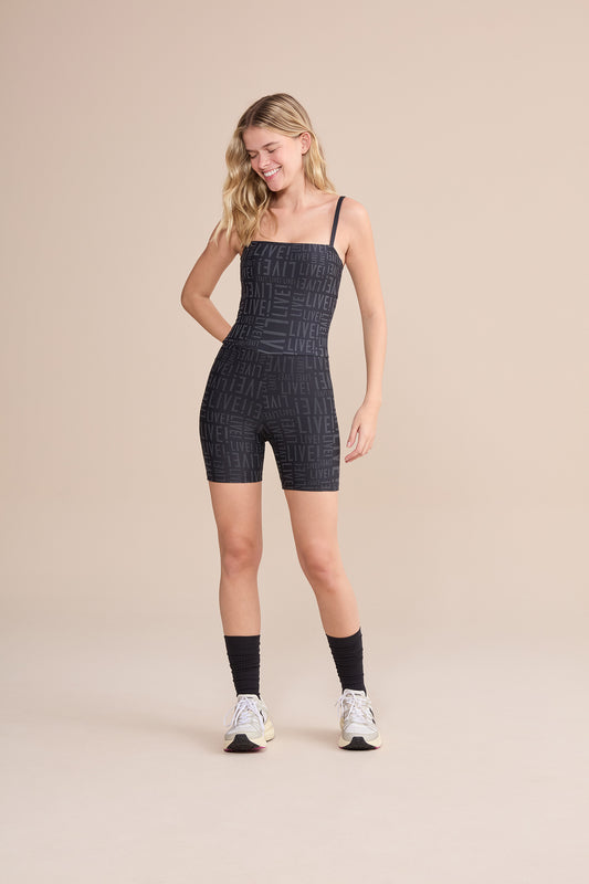 O Macaquinho LIVE! de comprimento shorts possui alças finas e abertura alongada nas costas, valorizando...