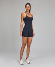 O Macacão Curto Elástico Personalizado apresenta decote regular com alças finas de elástico personalizado, bojo removível e decote nadador nas costas que garante liberdade de movimento e estilo. Seus recortes estratégicos valorizam a silhueta, enquanto o tecido macio de poliamida com elastano oferece boa compressão, cobertura e proteção UV50+. Disponível nas cores exclusivas azul ciano e preto.